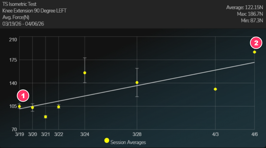 Knee Extension 90 Degree Average Force started at approximately 105N on March 19 — four days after the injury. By April 6 it had reached 187N. That is a 78% increase over 18 days of rehabilitation. Crucially, this is not a single spike — the trend line across the full session sequence is consistently upward.