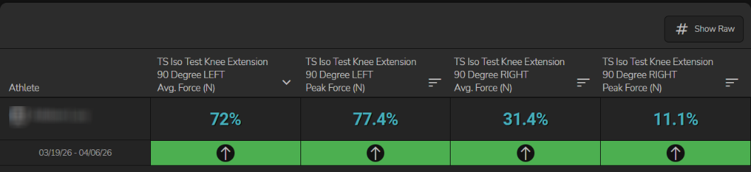 This is the detail that matters beyond the injury itself: the right knee is also improving significantly. Extension Average Force moved from 210N to 325N across the same period. Peak Force: 270N → 400N.